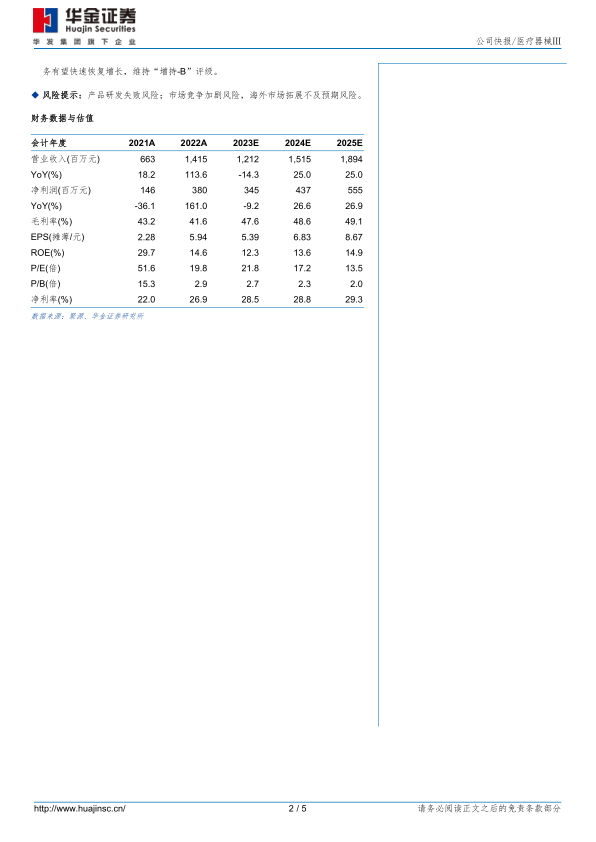 投资建议:考虑到2023年美国市场受飞利浦产品召回偶发影响消退,带来部分渠道库存影响公司业绩,我们下调盈利预测,预计公司2023-2025年收入分别为12.12/15.15/18.94(前值为18.91/23.57/30.39),增速-14%/25%/25%,归母净利润分别为3.45/4.37/5.55亿元(前值为5.09/6.71/8.73),增速-9%/27%/27%,对应PE分别为22/17/14倍。随着飞利浦停止在美国市场销售相关呼吸类设备产品,公司有望凭借产品高性价比优势,实现产品快速放量,加速库存压力释放,海外业务有望快速恢复增长,维持“增持-B”评级。