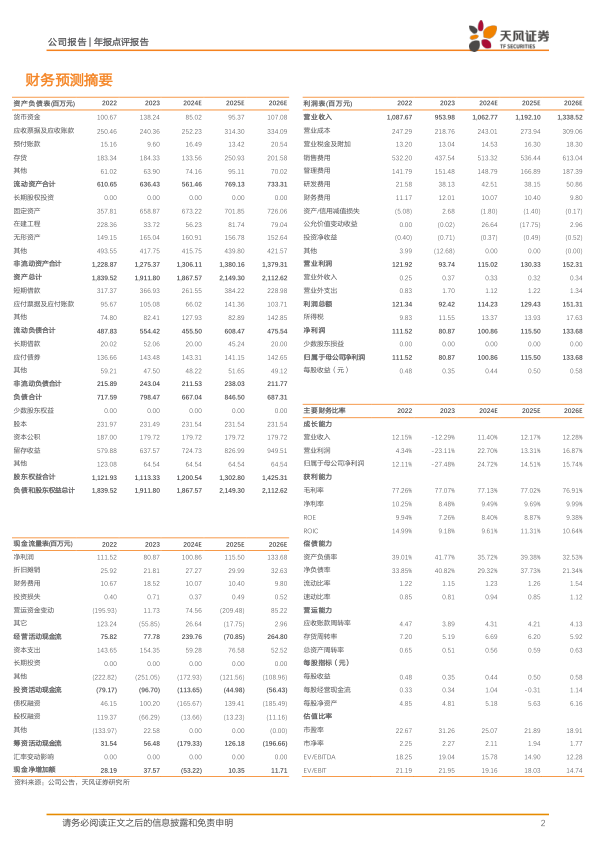 2023年公司持续加大研发投入,业绩短期承压,我们认为随着营销改革成效逐步兑现及外延并购落地,业绩有望恢复稳健增长。2024-2025年营业收入由15.64/18.67亿元下调至10.63/11.92亿元,2026年收入预测为13.39亿元;2024-2025年归母净利润预测由1.68/2.02亿元下调至1.01/1.16亿元,2026年归母净利润预测为1.34亿元。调整为“增持”评级。