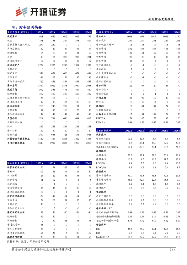 公司2023年实现营收9.54亿元(同比-12.29%,下文皆为同比口径);归母净利润0.81亿元(-27.48%);扣非归母净利润0.75亿元(-25.87%)。从盈利能力来看,2023年毛利率为77.07%(-0.2pct),净利率为8.48%(-1.78pct)。从费用端来看,2023年销售费用率为45.86%(-3.07pct);管理费用率为15.88%(+2.84pct);研发费用率为4.0%(+2.01pct);财务费用率为1.26%(+0.23pct)。考虑到公司未来产品研发及销售推广等费用支出,下调2024-2025年并新增2026年归母净利润预测,预计分别为1.04、1.24、1.50亿元(原预测2024-2025年为1.78、2.15亿元),EPS分别为0.45、0.53、0.65元/股,当前股价对应PE分别为27.1、22.8、18.8倍,同时我们看好公司外延并购带来的发展机遇,维持“买入”评级。