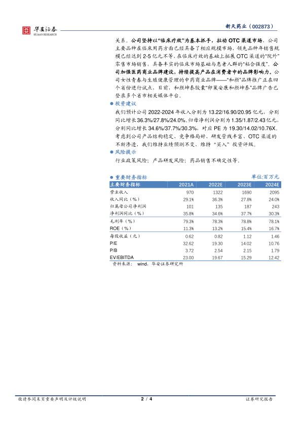 我们预计公司 2022-2024 年收入分别为 13.22/16.90/20.95 亿元,分别同比增长36.3%/27.8%/24.0%。归母净利润分别为1.35/1.87/2.43亿元,分别同比增长 34.6%/37.7%/30.3%,对应 PE 为 19.30/14.02/10.76X。考虑到公司产品结构稳定、 竞争格局好、 研发管线丰富、 OTC 渠道的不断渗透,我们维持业绩预测不变,维持“买入”投资评级。