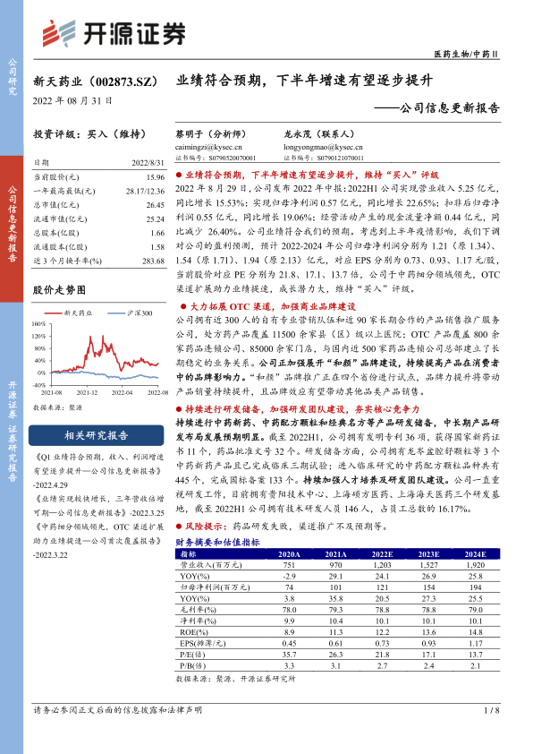 2022 年 8 月 29 日,公司发布 2022 年中报: 2022H1 公司实现营业收入 5.25 亿元,同比增长 15.53%;实现归母净利润 0.57 亿元,同比增长 22.65%;扣非后归母净利润 0.55 亿元,同比增长 19.06%;经营活动产生的现金流量净额 0.44 亿元,同比减少 26.40%。 公司业绩符合我们的预期。 考虑到上半年疫情影响,我们下调对公司的盈利预测,预计 2022-2024 年公司归母净利润分别为 1.21(原 1.34)、1.54(原 1.71)、 1.94(原 2.13)亿元,对应 EPS 分别为 0.73、 0.93、 1.17 元/股,当前股价对应 PE 分别为 21.8、 17.1、 13.7 倍,公司于中药细分领域领先, OTC渠道扩展助力业绩提速,成长潜力大,维持“买入”评级。