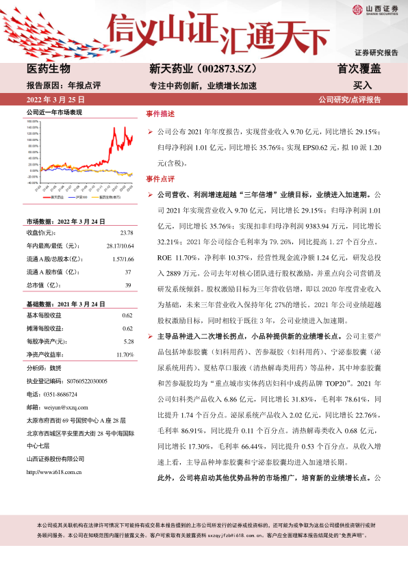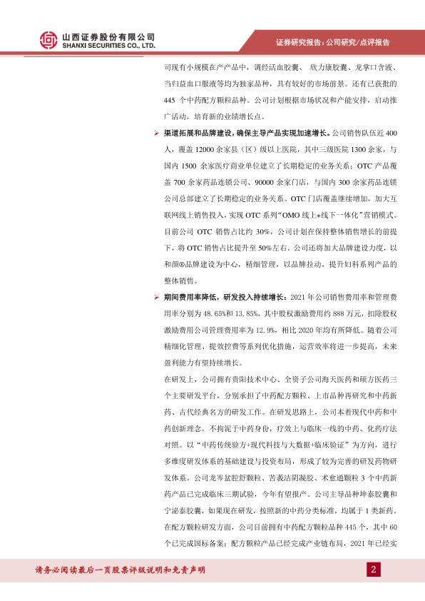 我们认为, 中药行业层面正在发生巨大的改变,中药新的分类和注册申报管理办法出台,解决了困扰中药行业多年的难题,中药创新药正渐行渐近。 公司坚持中药创新药的研究, 已上市产品以及即将上市的产品,如果现在进行研发,按照新的分类标准,均属于 1 类中药新药。 公司销售上拓展 OTC 渠道,增加线上销售,控费增效,加大品牌投入,同时启动二线品种的销售推广,研发上新品种今年即将报产, 已经形成“中药创新药+中药配方颗粒和在研经典名方+投资小分子化药创新药”的产品格局, 我们认为公司今年股权激励目标仍有望超预期完成。 预计公司2022-2024 年 EPS 分别为 0.82\1.12\1.51, 以 3 月 24 日收盘价 23.78 元计算, PE 分别 29.2\21.3\15.7 倍, 给予“买入” 评级。