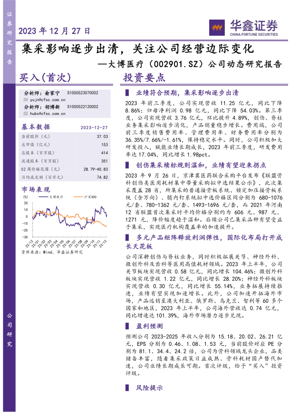 大博医疗在2023年前三季度虽面临集采带来的业绩压力,但第三季度已显现出经营改善的积极信号,集采负面影响正逐步出清。新一轮创伤集采续标规则的温和性,为公司已集采品种的市场覆盖率提升提供了机遇。同时,公司通过积极拓展关节、微创外科、神经外科等多元化产品线,并成功推进国际化战略,实现了新兴业务和海外市场的快速增长,为公司打开了新的成长空间。分析师预测公司未来几年收入和净利润将实现显著增长,并首次给予“买入”评级,认为其作为骨科龙头,在集采政策成熟和国产替代加速的背景下,具备巨大的长期成长潜力。然而,报告也提示了新品推广、集采影响、价格下降、市场竞争、成本上升及政策监管等潜在风险,需投资者关注。