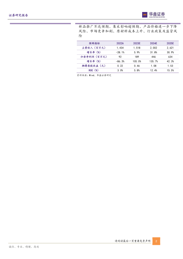 新品推广不达预期、集采影响超预期、产品价格进一步下降风险、市场竞争加剧、原材料成本上升、行业政策及监管风险