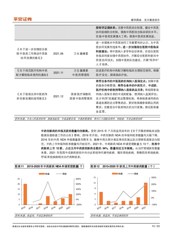 中药政策鼓励传承创新, 中药新药获批数量创新高: 自 2016 年《中华人民共和国中医药法》诞生,国家不断出台重磅支持政策推进中医药行业发展,鼓励中药传承与创新。同时,持续优化中药审评审批管理,完善中药分类注册管理,建立了“三结合”中药注册审评证据体系。 2021 年,中药新药 NDA 申请受理数量为 10 个,批准中药新药上市 12 款,占近五年中药获批新药总数的 54%,数量创近五年新高。