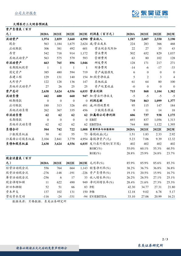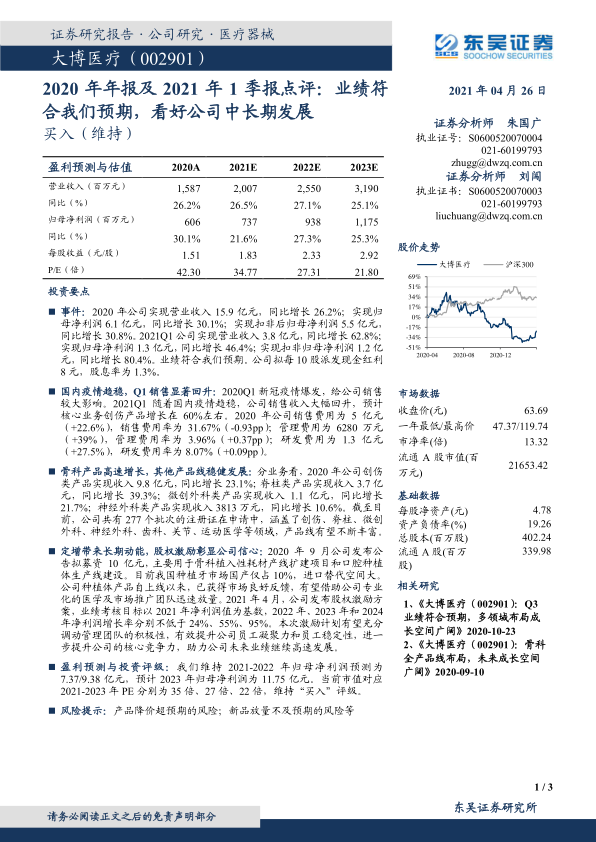本报告分析了大博医疗(002901)2020年年报及2021年一季报,指出公司业绩符合预期,并维持“买入”评级。报告强调了以下几个核心观点: