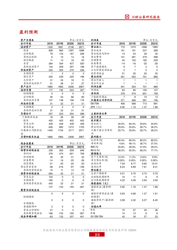 从估值比率来看,P/E从2018年的72倍下降至2021年预测的36倍,P/B从14倍下降至8倍,EV/EBITDA从42倍下降至22倍。随着盈利的持续增长,公司的估值水平逐步回归合理区间,相对于其高成长性和行业地位,具有一定的投资吸引力。