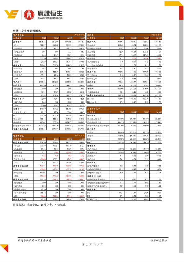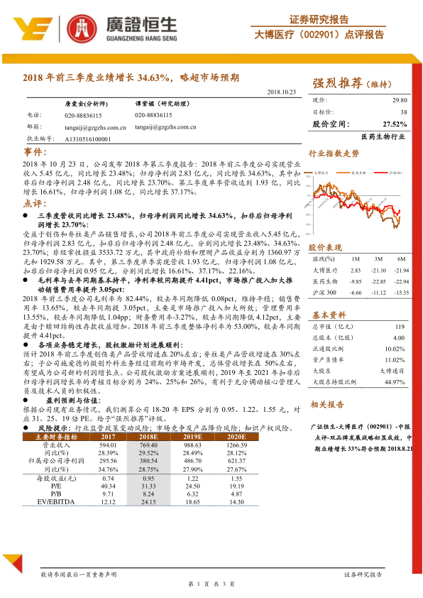 根据公司现有业务情况,分析师测算公司2018年至2020年每股收益(EPS)分别为0.95元、1.22元和1.55元,对应市盈率(PE)分别为31倍、25倍和19倍。基于此,维持对大博医疗的“强烈推荐”评级。