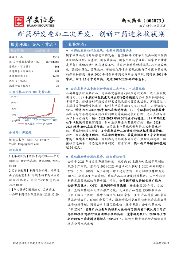 新天药业(002873)作为一家深耕现代中药研发、生产及销售的国家高新技术企业,正迎来中药行业政策回暖与创新加速的战略机遇期。国家层面自2016年《中医药法》颁布以来,通过顶层设计、审批优化、医保扶持等多维度政策,显著推动了中药产业的现代化与创新发展,尤其在2021年批准上市12个中药新药,超过此前四年总和,为创新中药企业提供了前所未有的发展空间。新天药业凭借其丰富的成熟产品线、持续加码的研发投入、三大创新中药即将上市的管线重估,以及通过股权激励和战略投资汇伦生物实现商业价值放大的多元化布局,展现出强劲的增长潜力和市场竞争力。