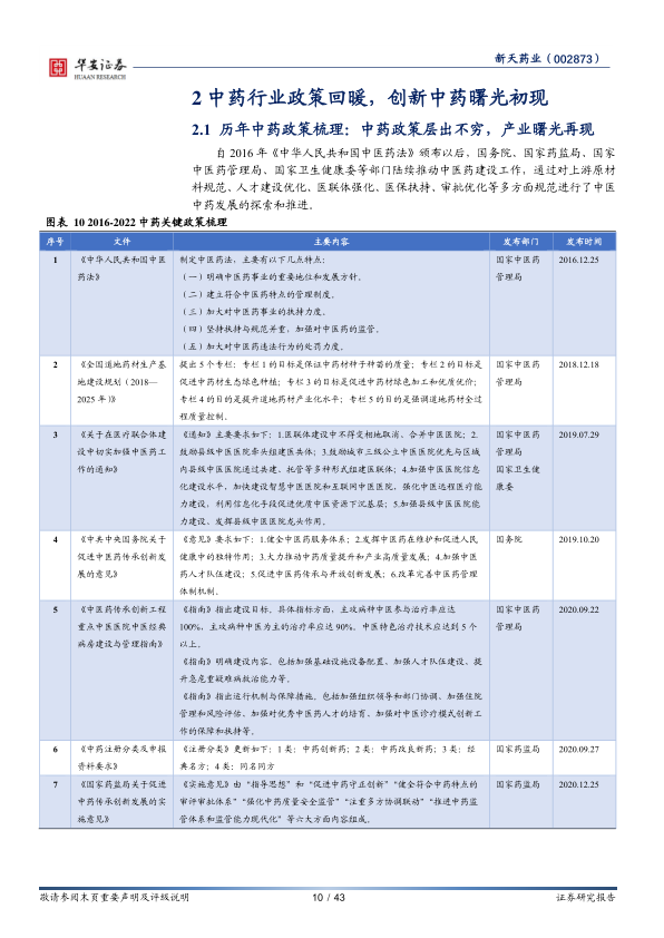 国家从顶层设计开始推动中药发展,自2016年《中华人民共和国中医药法》颁布以后,国务院、国家药监局、国家中医药管理局、国家卫生健康委等部门陆续推动中医药建设工作,通过对上游原材料规范、人才建设优化、医联体强化、医保扶持、审批优化等多方面规范进行了中医中药发展的探索和推进,并在2020年将创新中药的注册分类单列。同时在2021年审批上市了12个中药新药,超过2017-2020年四年总和。