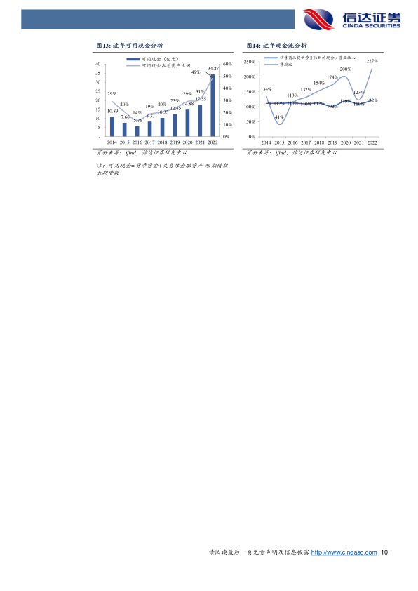 公司自2014年上市以来持续推进现金分红,2018-2019年分红比例超过100%,2020年虽受疫情冲击仍实现34.55%分红。2022年公司股息率达4.31%。从可用现金(货币资金+交易性金融资产-短期借款-长期借款)角度看,公司可用现金持续上升,2022年达34.27亿元,占总资产比例49%,现金充裕。公司现金流状况健康,2014-2022年销售商品提供劳务收到的现金/营业收入比例均维持在100%以上(2022年达122%),净利润现金含量(净现比)2016-2022年均维持在100%以上(2022年达227%),表明公司现金收入良好且运营稳健,未来分红回报或有机会提升。