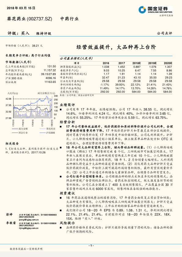 葵花药业凭借其经营效益的提升、大品种战略的实施以及销售体系的优势,在2017年取得了超预期的业绩增长。报告预计,随着大品种的持续放量和后续潜力品种的发力,公司未来业绩将保持稳定增长。维持“买入”评级,但同时也提示了品牌药价格体系、护肝片提价以及储备品种推广等方面的风险。