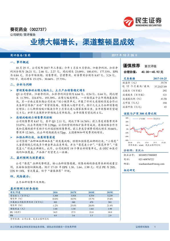 报告提供了葵花药业2016年实际数据及2017年至2019年的预测财务指标,展现了公司未来的增长潜力。