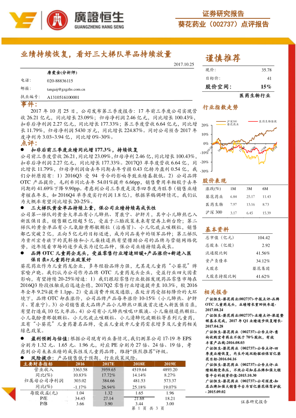 考虑到公司未来业绩的成长性和在儿童药领域的品牌优势,分析师维持“强烈推荐”的投资评级,目标价41元,预计股价空间为15%。
