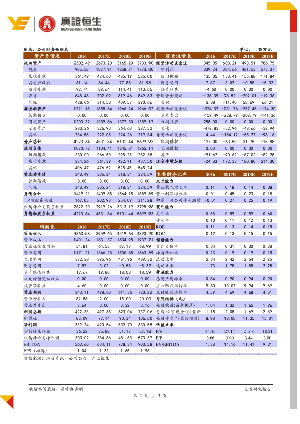 根据公司现有业务情况,分析师预测葵花药业2017年至2019年的每股收益(EPS)分别为1.32元、1.65元和1.96元。对应的市盈率(PE)分别为27倍、24倍和19倍。