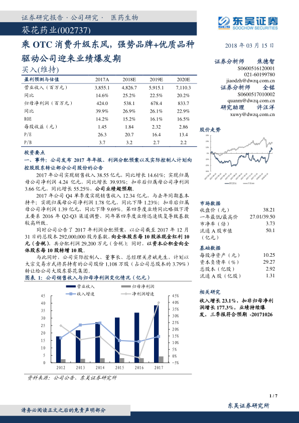 本报告通过对葵花药业2017年业绩的分析,指出公司在OTC消费升级和营销改革的背景下,凭借品牌和品种优势,业绩迎来爆发期。公司通过“黄金大单品”策略、费用控制和高股息分配,进一步巩固了其市场地位。维持“买入”评级,并提示了相关风险。