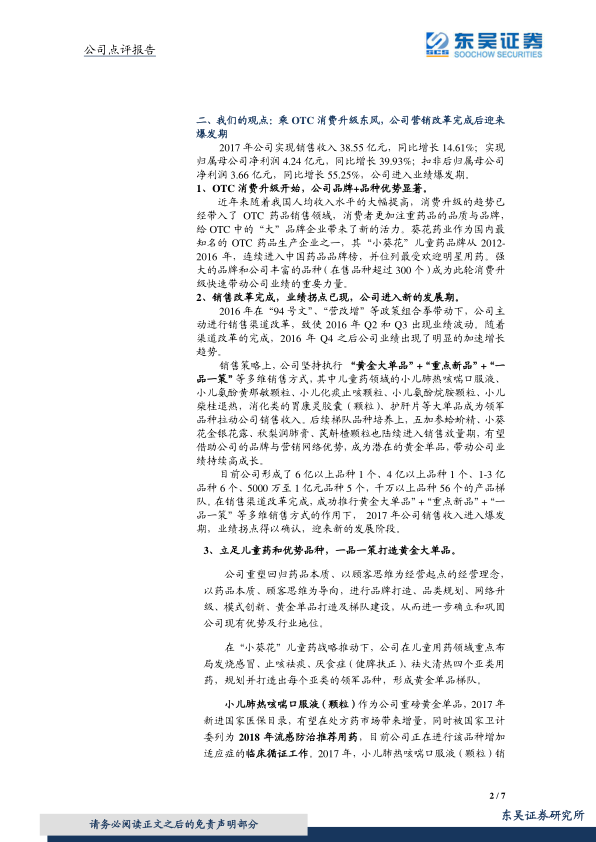 2017年冬季流感爆发,儿童流感成为重灾区。公司拥有小儿肺热咳喘口服液、小儿柴桂、小儿氨酚黄那敏等一系列重点儿童感冒用药,凸显公司儿童药产品的品质与疗效。