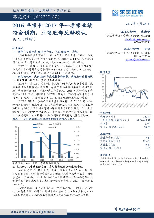 本报告分析了葵花药业2016年年报和2017年一季报的业绩,认为公司已经走出2016年渠道整合的阴影,业绩底部反转趋势确立。