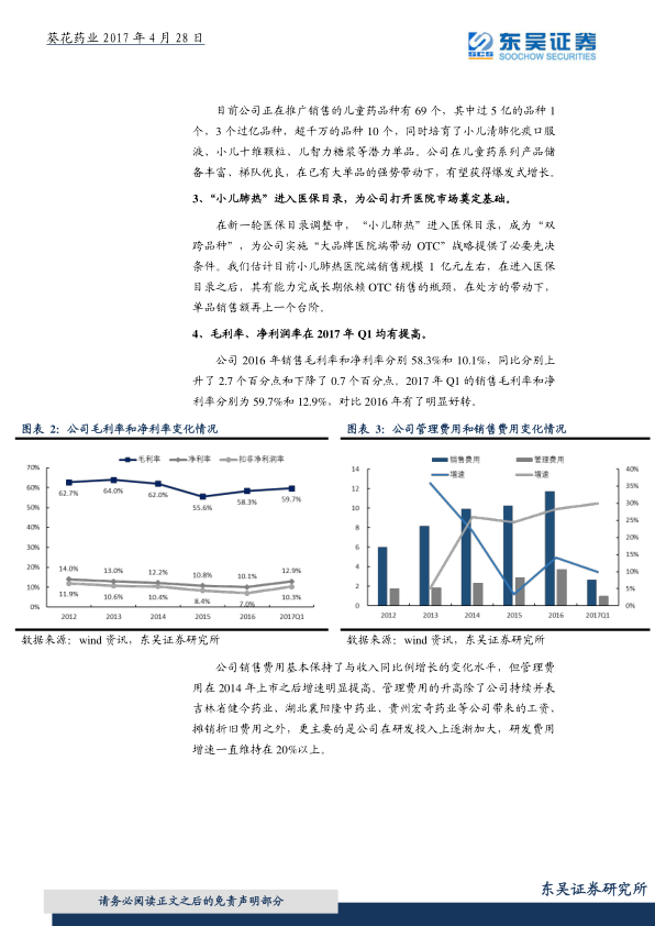 本报告认为葵花药业已经走出渠道整合的阴影,业绩底部反转趋势确立。公司的大品种战略和儿童药领域的优势将驱动未来业绩增长。“小儿肺热”进入医保目录为公司打开医院市场奠定基础。维持“买入”评级。但需注意小儿肺热咳喘系列药物进入医保后放量低于预期以及医院市场开拓低于预期的风险。