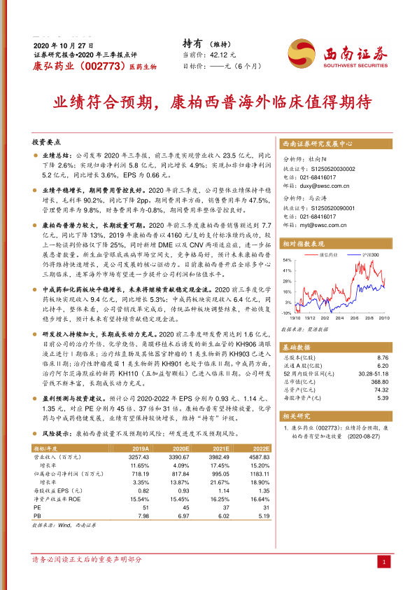 盈利预测与投资建议。 预计公司 2020-2022 年 EPS 分别为 0.93 元、 1.14 元、1.35 元,对应 PE 分别为 45 倍、 37 倍和 31 倍。康柏西普有望持续放量, 化学药与中成药稳健发展,业绩有望保持较快增长,维持“持有”评级。