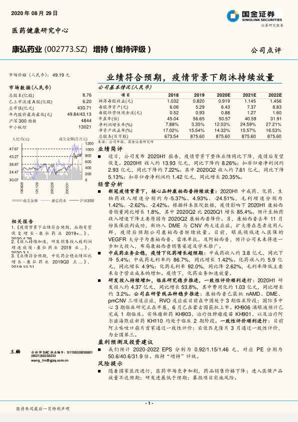 报告强调,康弘药业持续加大研发投入,多项在研管线稳步推进,并在一致性评价方面取得积极进展,这预示着公司未来业绩增长的潜力。同时,中成药业务企稳,化药业务在疫情背景下实现超预期增长,共同支撑了公司的多元化发展和市场地位。
