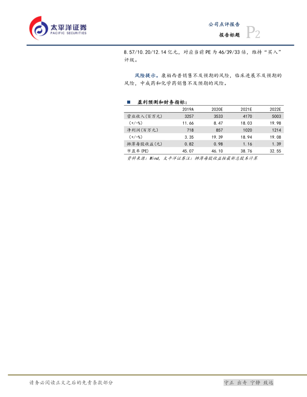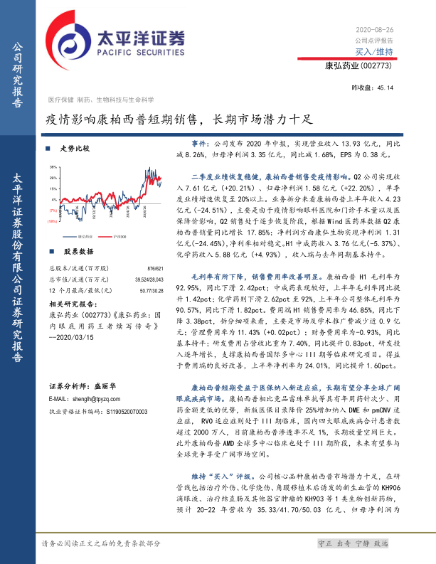 本报告分析了康弘药业2020年中期业绩,指出疫情对康柏西普销售的短期影响,但强调其长期市场潜力。报告详细分析了康柏西普的竞争优势、市场前景以及公司在研管线,并给出了盈利预测和投资评级。总体而言,康弘药业核心品种市场潜力十足,维持“买入”评级,但投资者需关注相关风险。