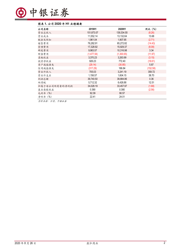 2020年上半年,康弘药业实现营业收入13.93亿元,同比下降8.26%;归母净利润3.35亿元,同比下降1.68%。疫情期间医院门诊的关停对公司业绩造成了不利影响。具体来看,上半年公司毛利率为90.57%,同比下降1.82个百分点。其中,生物制药业务(主要为康柏西普)实现销售收入4.23亿元,同比大幅减少25%,主要原因是康柏西普眼用注射液的使用需要进行手术,受疫情影响较大。中成药业务销售收入3.76亿元,同比减少5%。相比之下,化学制药业务表现出较强的抗风险能力,实现销售收入5.88亿元,同比增长5%。