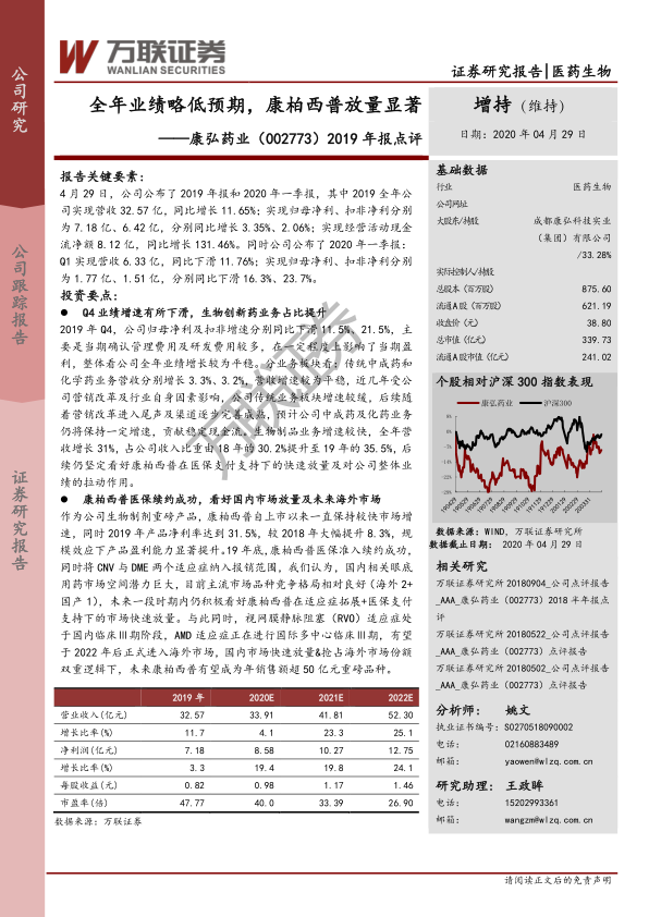 本报告对康弘药业(002773)2019年年报和2020年一季报进行了分析,核心观点如下: