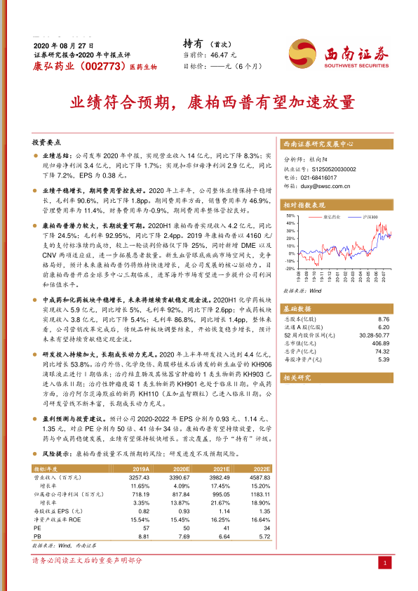 鉴于公司核心产品康柏西普有望持续放量,化学药与中成药稳健发展,业绩有望保持较快增长,首次覆盖给予“持有”评级。