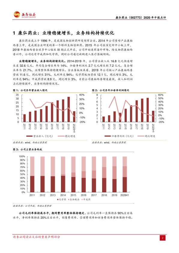 基于康柏西普的持续放量、化学药与中成药的稳健发展以及医疗器械业务的高速增长,预计公司2020-2022年营业收入分别为33.9亿元、39.8亿元和45.9亿元,归母净利润分别为8.2亿元、9.9亿元和11.8亿元,对应EPS分别为0.93元、1.14元和1.35元。
