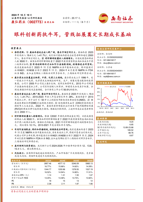 推荐逻辑:1)康柏西普适应症人群广阔,潜在市场空间巨大。康柏西普2023年实现收入19.4亿元(+41.7%),我们估计康柏西普适应症患者群体超过2000万人,潜在市场空间巨大。2)舒肝解郁胶囊收入持续增长。目前我国患抑郁症人数9500万。独家品种舒肝解郁胶囊于2022年获得国家药监局批准成为中药二级保护品种。3)布局创新眼科疗法和阿尔兹海默领域,持续推进在研管线。高浓度康柏西普于2023年11月获NMPA批准开展临床试验,眼科基因疗法KH631、KH658分别于2022年11月、2024年4月获得NMPA和FDA批准IND。五加益智颗粒二期临床对照多奈哌齐,三期临床研究即将启动。