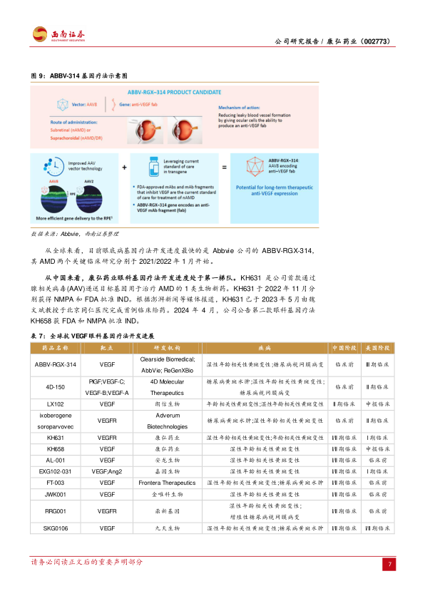 在眼科领域,公司的高浓度康柏西普眼用注射液(KH902-R10)于2023年11月获得NMPA批准开展临床试验。高浓度制剂有望显著降低患者的治疗依从度,例如,高浓度阿柏西普在96周治疗AMD或DME的平均注射次数为8次,远低于常规浓度制剂的13/14次。若高浓度康柏西普成功上市,将进一步巩固公司在眼科市场的优势地位。更具前瞻性的是,康弘药业在眼科基因疗法领域取得了重要进展。眼科基因疗法具有给药方式简便、安全、转导细胞效率高等优势,有望实现一次治疗,超长期有效的治疗效果。公司的KH631是首款通过腺相关病毒(AAV)递送目标基因用于治疗AMD的1类生物新药,已于2022年11月获得NMPA和FDA的IND批准,并于2023年5月完成首例临床给药。此外,第二款眼科基因疗法KH658也于2024年4月获得FDA和NMPA的IND批准。康弘药业在眼科基因疗法开发进度上处于国内第一梯队,与全球领先企业如Abbvie的ABBV-RGX-314等共同推动该领域的发展。