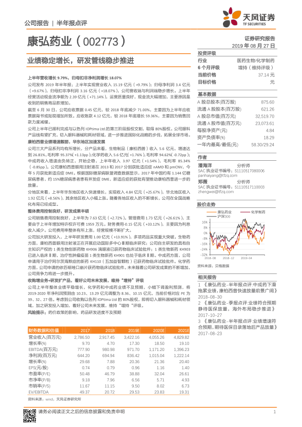 康弘药业2019年上半年业绩稳健增长,康柏西普驱动增长,华东市场表现亮眼,研发投入加大,创新成果显著。公司通过收购IOPtima Ltd.拓展眼科器械和耗材领域,并持续加大研发投入,为未来发展奠定基础。天风证券维持对康弘药业的“增持”评级,但同时提示投资者关注药价政策和药品研发进度等风险因素。