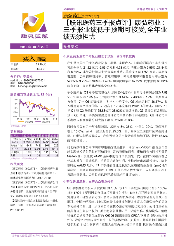 康弘药业2018年三季报业绩虽略低于市场预期,但主要受去年同期高基数影响,全年业绩增长仍有保障。公司核心产品康柏西普注射液市场表现强劲,受益于医保政策和适应症拓展,未来增长空间广阔,且已启动国际化临床试验。同时,公司在研管线丰富,多项创新药物进展顺利,为公司长期发展提供了坚实基础。报告维持“买入”评级,并给出了44.4元的目标价,认为公司作为创新药龙头,具备良好的投资价值。投资者需关注业绩下滑、产品竞争和新品获批不及预期等潜在风险。