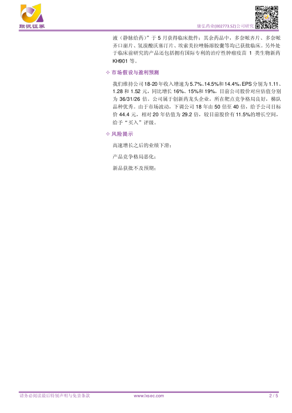报告维持公司2018-2020年收入增速预测分别为5.7%、14.5%和14.4%,EPS分别为1.11元、1.28元和1.52元,同比增长16%、15%和19%。当前股价对应估值分别为36/31/26倍。鉴于公司作为创新药龙头企业,所在靶点竞争格局良好,梯队品种优秀,报告下调2018年估值至40倍,给予目标价44.4元,相对2020年估值为29.2倍,较当前股价有11.5%的增长空间,维持“买入”评级。