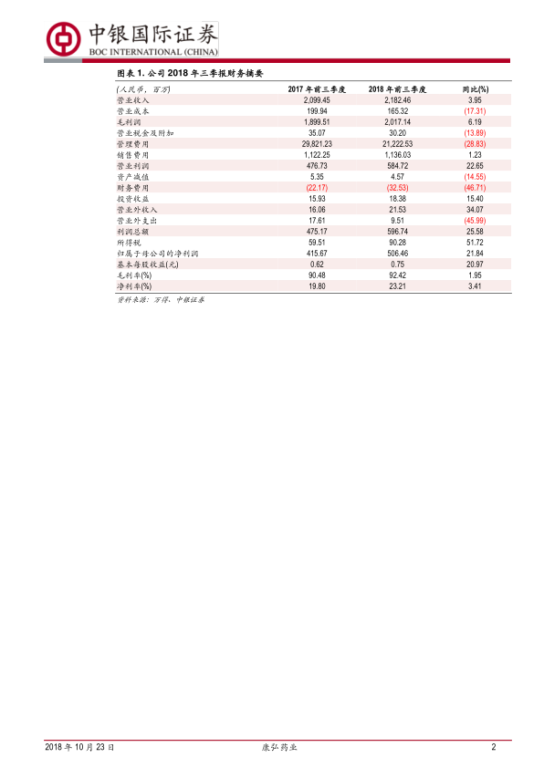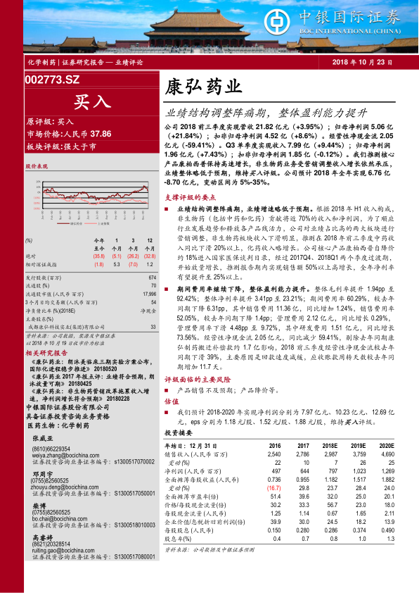 康弘药业正处于业绩结构调整的阵痛期,非生物药业务收入下滑,但核心产品康柏西普保持高速增长,公司整体盈利能力有所提升。报告维持“买入”评级,并预测了公司未来几年的盈利情况。同时,报告也提示了产品销售不及预期和产品降价等风险。