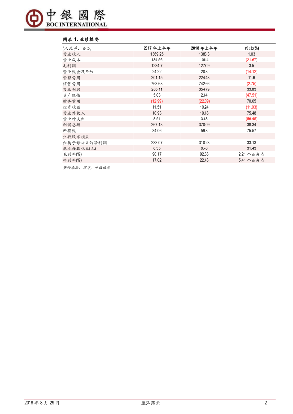 化药业务在2018年上半年实现收入5.5亿元,同比增长3.695%,在营收中的比重从去年同期的38.76%微升至39.78%。化药业务的营业成本同比减少6.58%,毛利率为95.34%,基本与去年同期持平。尽管化药业务保持了平稳增长,但整体非生物药板块的销售调整工作预计在下半年仍将继续。这意味着非生物药业务的整体增速在短期内仍将受到一定影响,需要时间来消化调整带来的冲击。