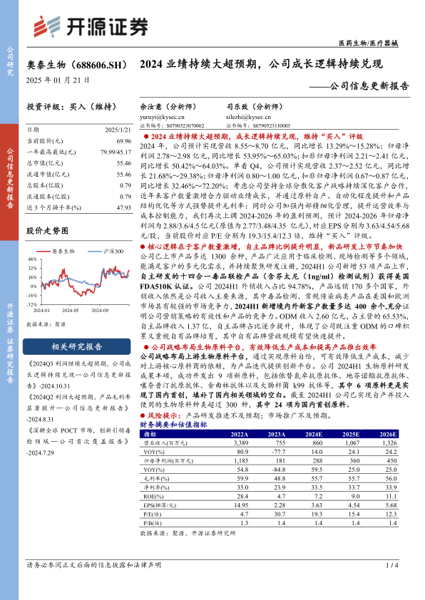 奥泰生物在2024年展现出持续超预期的业绩增长,其核心驱动力在于全球化的客户拓展策略、不断扩大的客户基础、以及通过精细化管理和产品结构优化带来的盈利能力提升。公司在产品研发和生物原料平台建设方面的战略布局,进一步巩固了其市场竞争优势和长期成长潜力。尽管面临产品研发和市场推广的潜在风险,但鉴于其强劲的增长势头和稳健的战略执行,公司未来发展前景依然乐观,维持“买入”评级。
