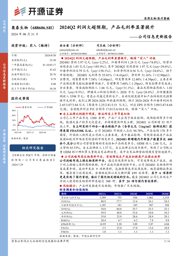 研奥泰生物(688606.SH)2024Q2 利润大幅超出市场预期,主要得益于产品毛利率的显著提升。公司通过原料自产、自动化程度提升和产品结构优化,有效控制了成本,提高了盈利能力。