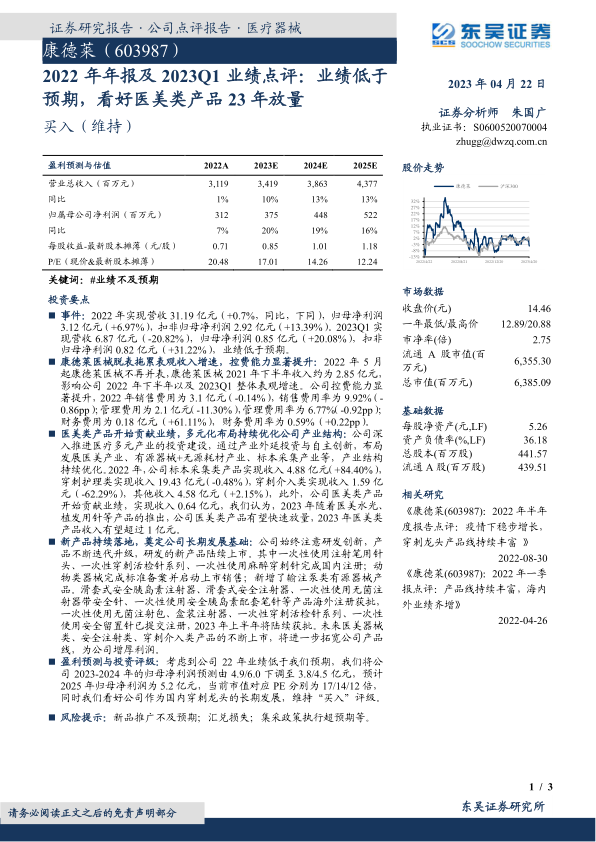 康德莱(603987)在2022年及2023年第一季度面临康德莱医械脱表导致的营收增速放缓和业绩低于预期的挑战。然而,公司展现出显著的控费能力,销售费用率和管理费用率均有所下降。在战略层面,公司积极进行多元化产业布局,医美类产品已开始贡献业绩并有望在2023年实现快速放量,标本采集类产品也实现高速增长。同时,公司持续投入研发,多款新产品在国内和海外市场陆续注册或获批,为未来的长期增长奠定了坚实基础。尽管分析师下调了近期的盈利预测,但鉴于公司在穿刺领域的龙头地位、优化的产业结构以及持续创新的能力,维持“买入”评级,看好其长期发展潜力。投资者需关注新品推广、汇兑损失及集采政策等潜在风险。