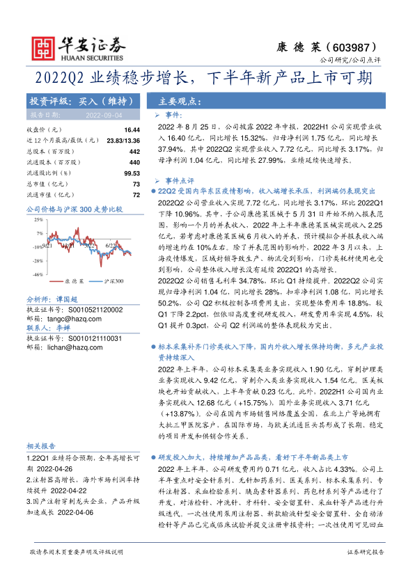 2022Q2业绩稳步增长,下半年新产品上市可期