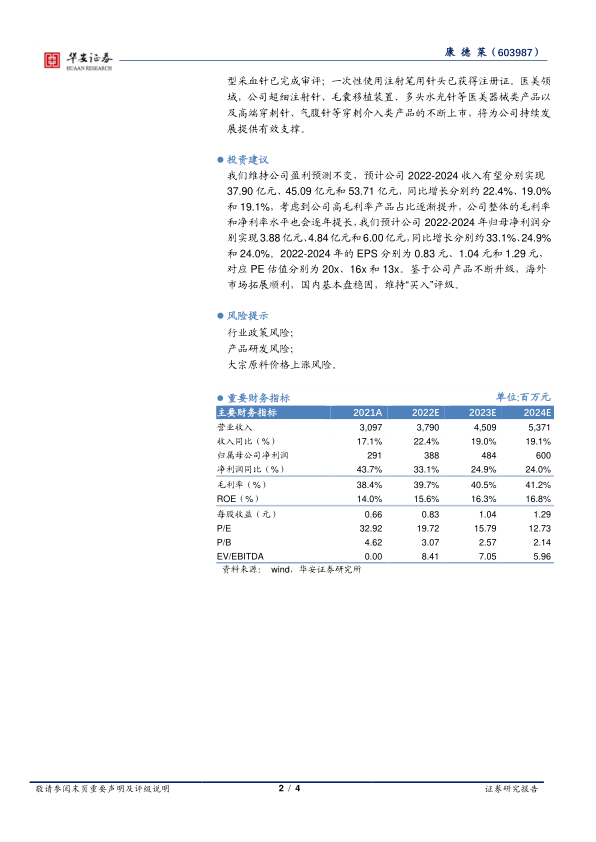 我们维持公司盈利预测不变,预计公司2022-2024收入有望分别实现37.90亿元、45.09亿元和53.71亿元,同比增长分别约22.4%、19.0%和19.1%,考虑到公司高毛利率产品占比逐渐提升,公司整体的毛利率和净利率水平也会逐年提长,我们预计公司2022-2024年归母净利润分别实现3.88亿元、4.84亿元和6.00亿元,同比增长分别约33.1%、24.9%和24.0%。2022-2024年的EPS分别为0.83元、1.04元和1.29元,对应PE估值分别为20x、16x和13x。鉴于公司产品不断升级,海外市场拓展顺利,国内基本盘稳固,维持“买入”评级。