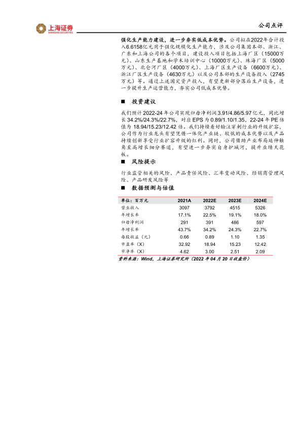 我们预计2022-24年公司实现归母净利润3.91/4.86/5.97亿元,同比增长34.2%/24.3%/22.7%,对应EPS为0.89/1.10/1.35,22-24年PE估值为18.94/15.23/12.42倍。我们持续看好输注穿刺行业的升级扩容,公司作为行业龙头有望凭借一体化产业链、较低的成本优势以及产品持续创新享受行业扩容升级的红利。同时,公司借助产业布局延伸触角至高增长细分赛道,有望进一步夯实自身护城河,提升业绩天花板。
