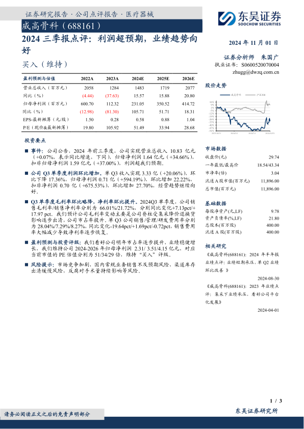 本报告对威高骨科2024年三季报进行了点评,指出公司利润超预期,Q3单季度利润环比增加,净利率环比提升,经营趋势向好。维持公司2024-2026年盈利预测,维持“买入”评级,并提示了相关风险。