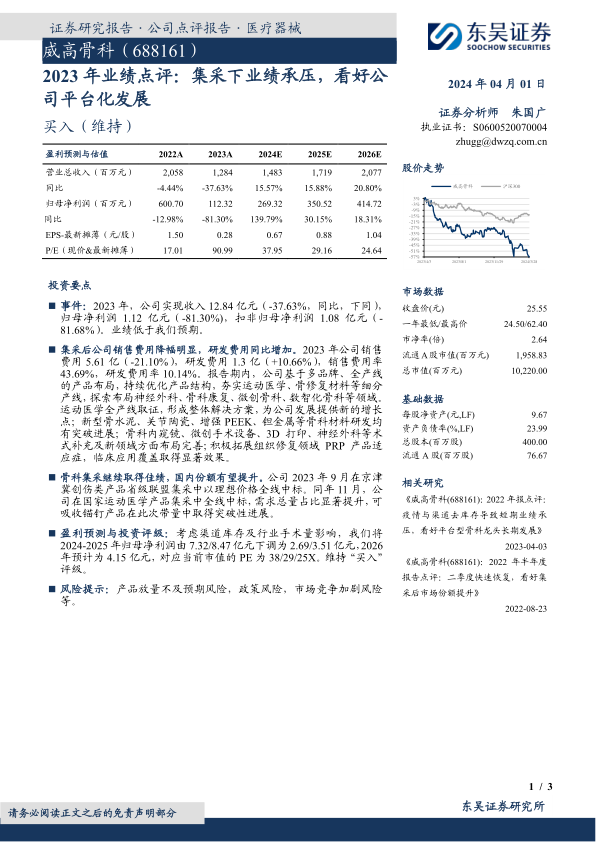 本报告分析了威高骨科2023年的业绩表现,指出集采是业绩下滑的主要原因。尽管短期业绩承压,但公司在产品研发、市场拓展和集采应对方面均有积极表现。公司通过优化产品结构、拓展新领域、积极参与集采等方式,有望在未来实现业绩增长。虽然下调了盈利预测,但维持“买入”评级,表明对公司长期发展前景的看好。