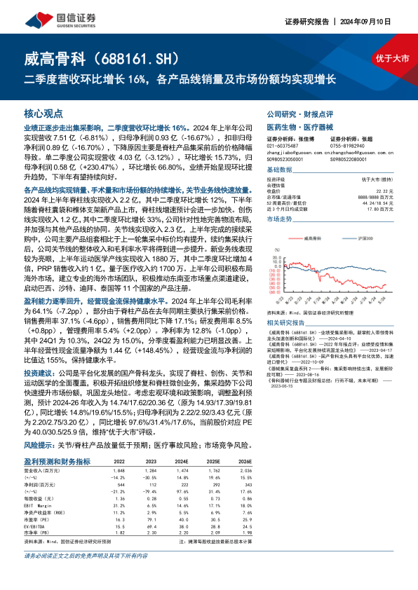 公司作为平台化发展的国产骨科龙头,全面覆盖脊柱、创伤、关节和运动医学,并积极开拓组织修复和脊柱微创业务。在集采趋势下,公司快速提升市场份额,巩固龙头地位。考虑到国内骨科行业手术渗透率仍较低,未来有望保持稳健增长。国信证券调整盈利预测,预计2024-2026年收入分别为14.74/17.62/20.36亿元,同比增长14.8%/19.6%/15.5%;归母净利润分别为2.22/2.92/3.43亿元,同比增长97.6%/31.4%/17.6%。维持“优于大市”评级。