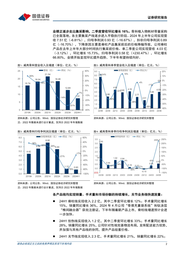 2024年上半年脊柱线实现收入2.2亿元,其中二季度环比增长12%。手术量同比增长15%,销量同比增长36%。随着“骨填充囊袋系统”和钛涂层“椎间融合器”等新产品获批上市,预计下半年脊柱线增速将进一步加快。