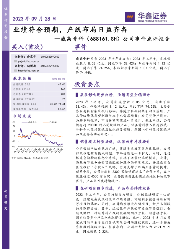 威高骨科2023年上半年业绩受集采影响下滑,但公司通过积极的销售模式转型、研发投入和产品线拓展,有望在集采常态化背景下实现市场份额的提升和业绩的企稳回升。首次覆盖,给予“买入”投资评级,需关注相关风险。