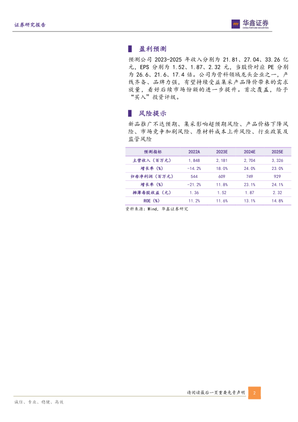 预测公司2023-2025年收入分别为21.81、27.04、33.26亿元,EPS分别为1.52、1.87、2.32元,当股价对应PE分别为26.6、21.6、17.4倍。公司为骨科领域龙头企业之一,产线齐备、品牌力强,有望持续受益集采产品降价带来的需求放量,看好后续市场份额的进一步提升。首次覆盖,给予“买入”投资评级。