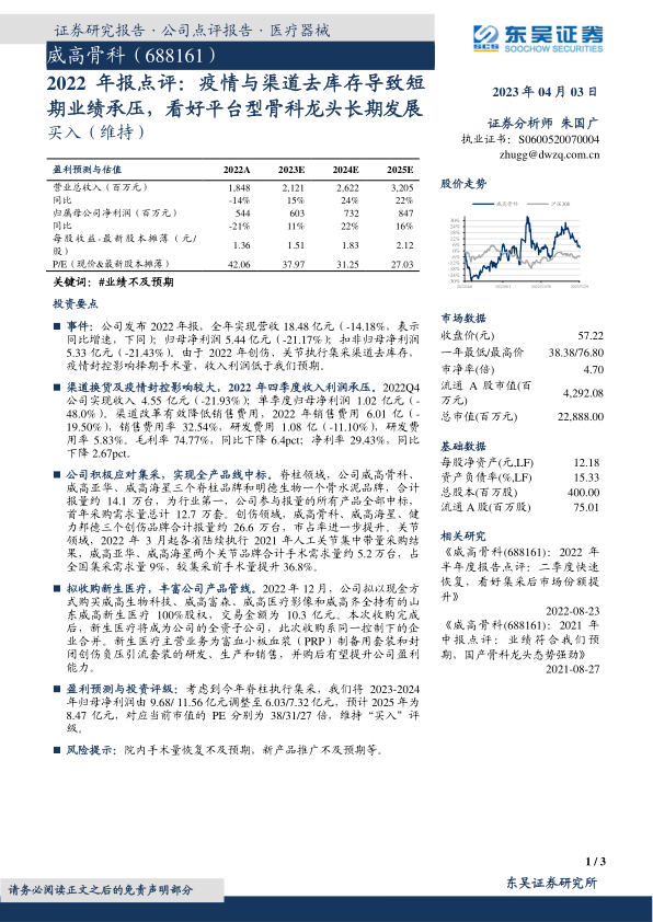 威高骨科2022年业绩受集采渠道去库存和疫情影响,短期内面临营收和利润承压。然而,公司积极应对集采,实现全产品线中标并提升市场份额,同时通过收购新生医疗拓展产品线,展现了其作为平台型骨科龙头的长期发展潜力。尽管盈利预测有所下调,但报告维持“买入”评级,看好公司在骨科领域的长期发展前景。